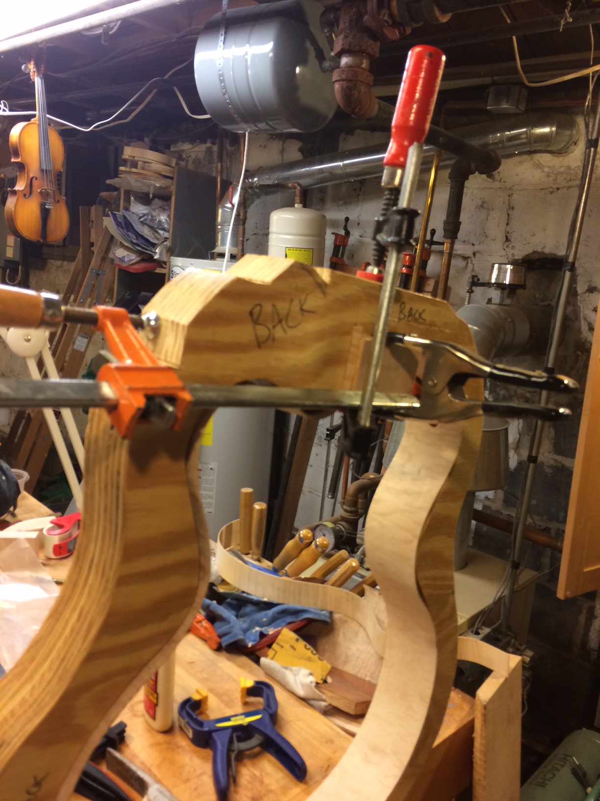 Veneering the headstock with maple burl veneer was more stressful than it should have been. After slicing the veneer and planing it with the safe-T- planer, the thin veneer curled up like a scroll once the glue hit it and was scalloped along the edges where the cauls didn't contact the veneer directly. Below is a picture of the rig of clamps I had to use to control the veneer. As it turns out, the edges were cut off once the headstock shape was determined so it was much ado about nothing. Feel free to laugh.